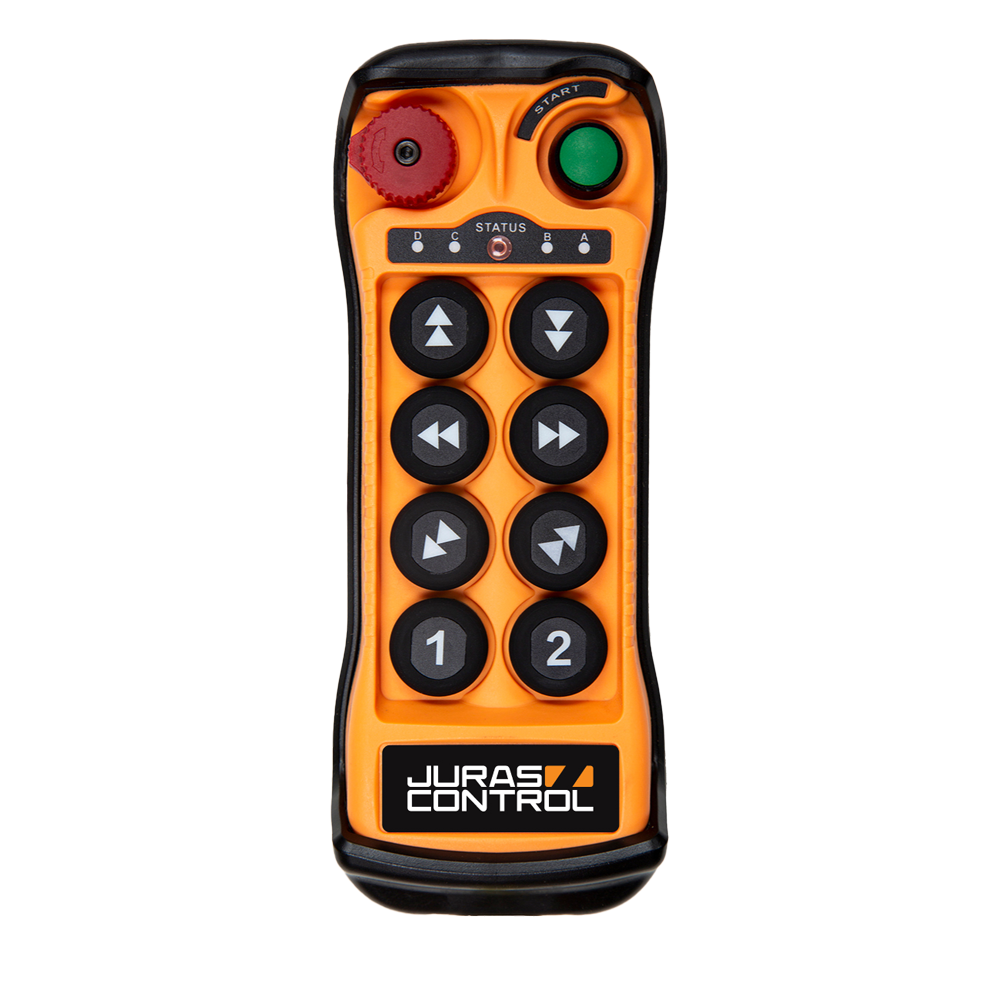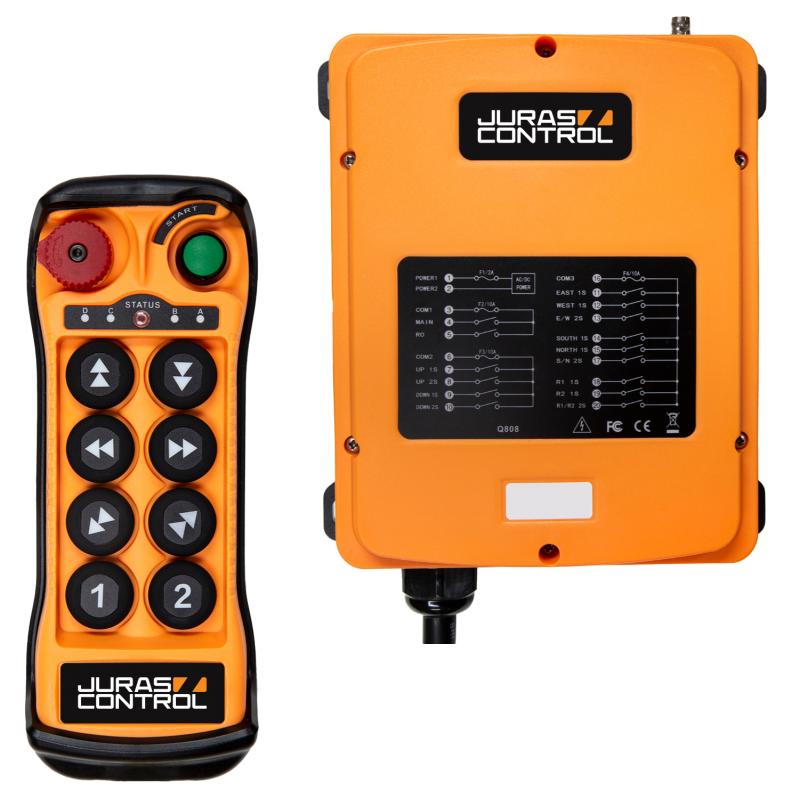 Jeden z nejprodávanějších rádiových ovladačů JC-Q800/JC-Q808 pro jednonosníkové jeřáby disponuje 6 tlačítky pro směrové povely a 2 tlačítky, která lze naprogramovat dle vašich požadavků (osvětlení, přemostění, magnetizace, rezerva atd.)